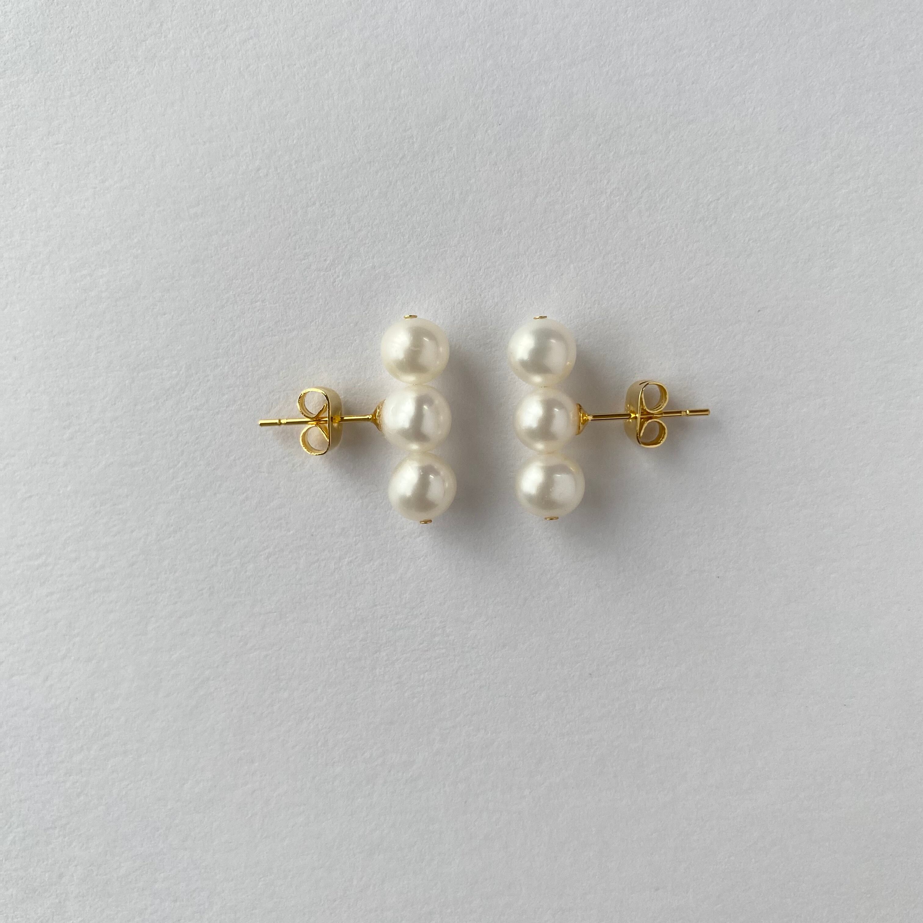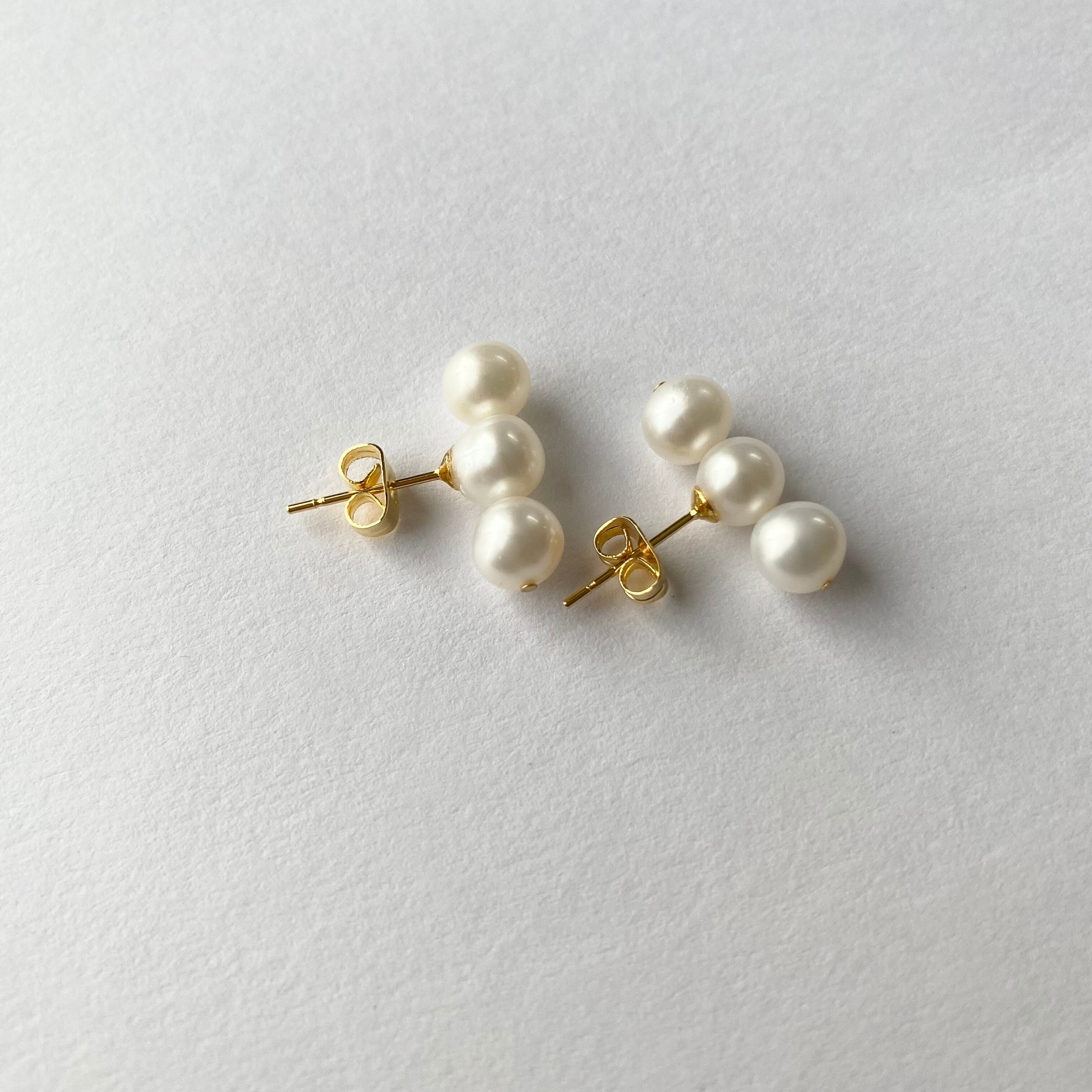 柔らかな光沢をまとった3粒の淡水パールを並べた、