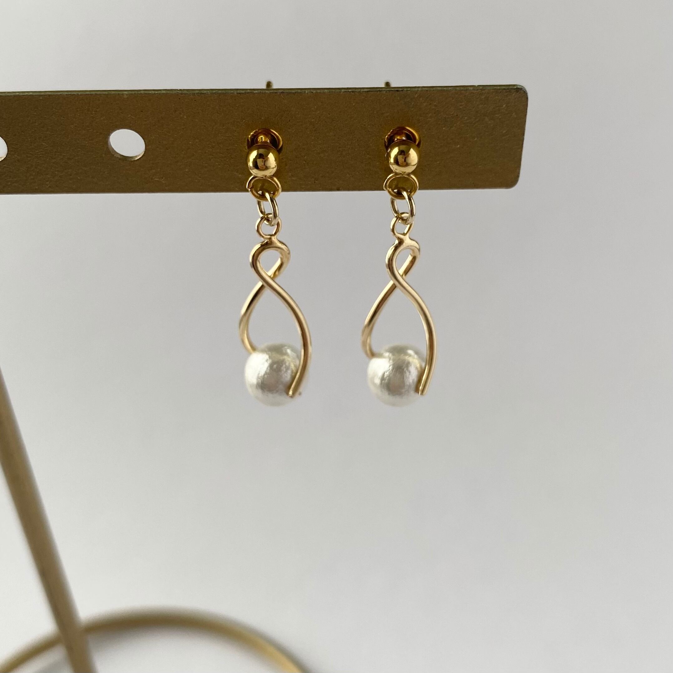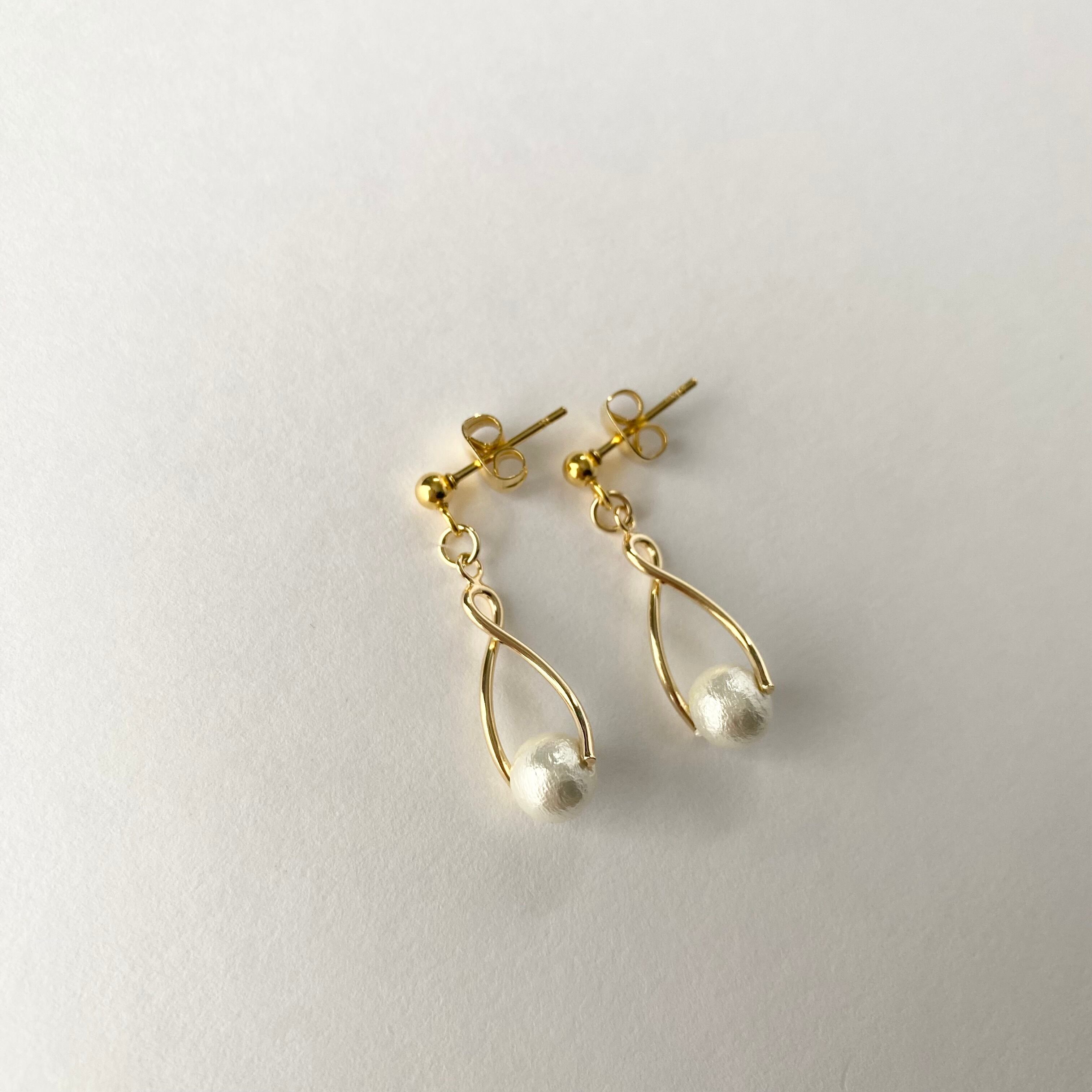 ツイストパーツにコットンパールを使用したピアス。